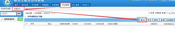 学位管理->发表论文:点击“增加”按钮,按照要求填写,提交